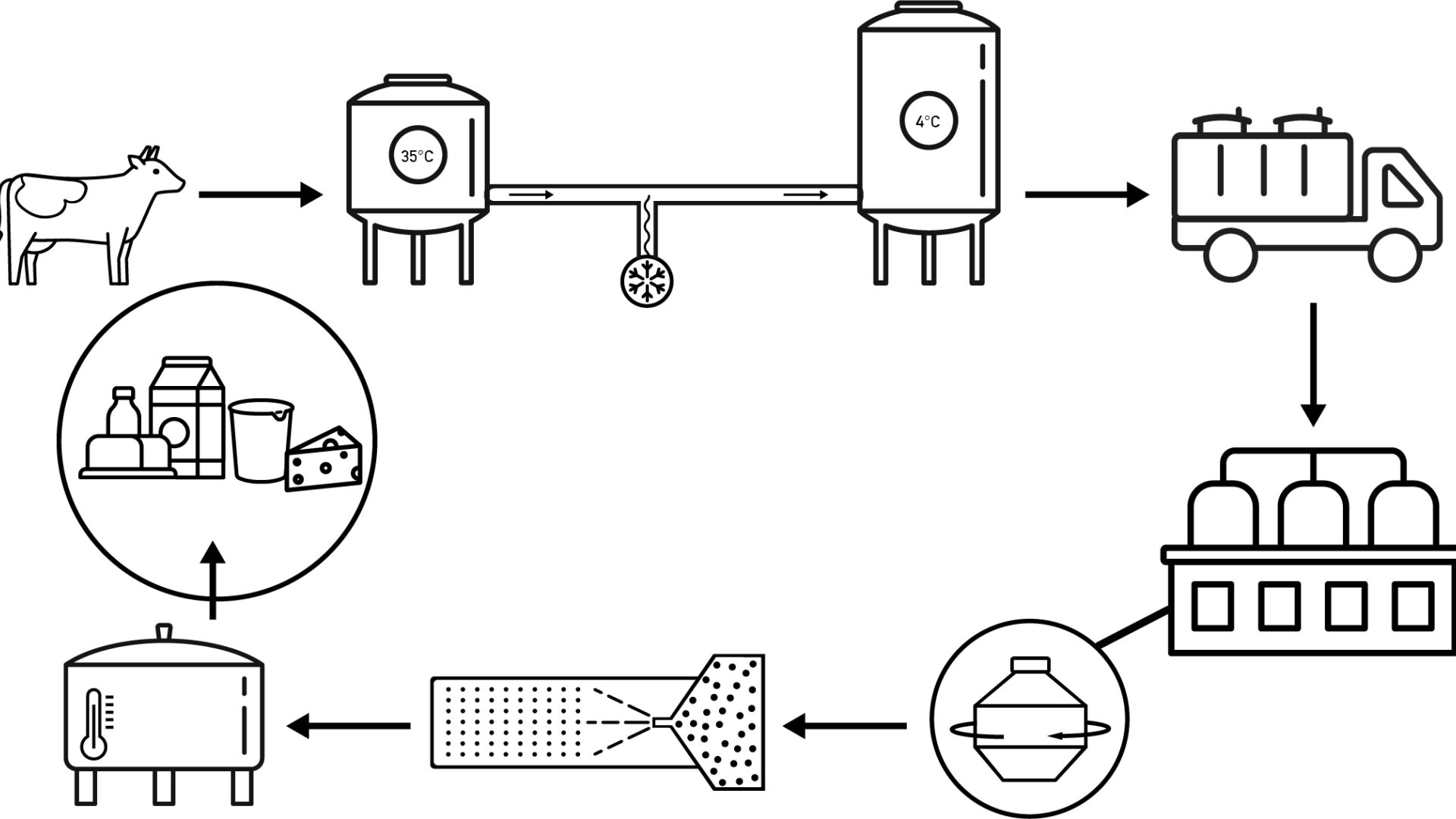 Der Kreislauf der Milch: Nach dem Melken wird die Milch in großen Tanks heruntergekühlt. Von dort wird sie in den Milchsammelwagen gepumpt und in der Molkerei weiterverarbeitet. Nach der Homogenisierung und Pasteurisierung wird die Rohmilch entweder zu vielen leckeren Produkten weiterverarbeitet oder als Trinkmilch verpackt und an den Handel geliefert.