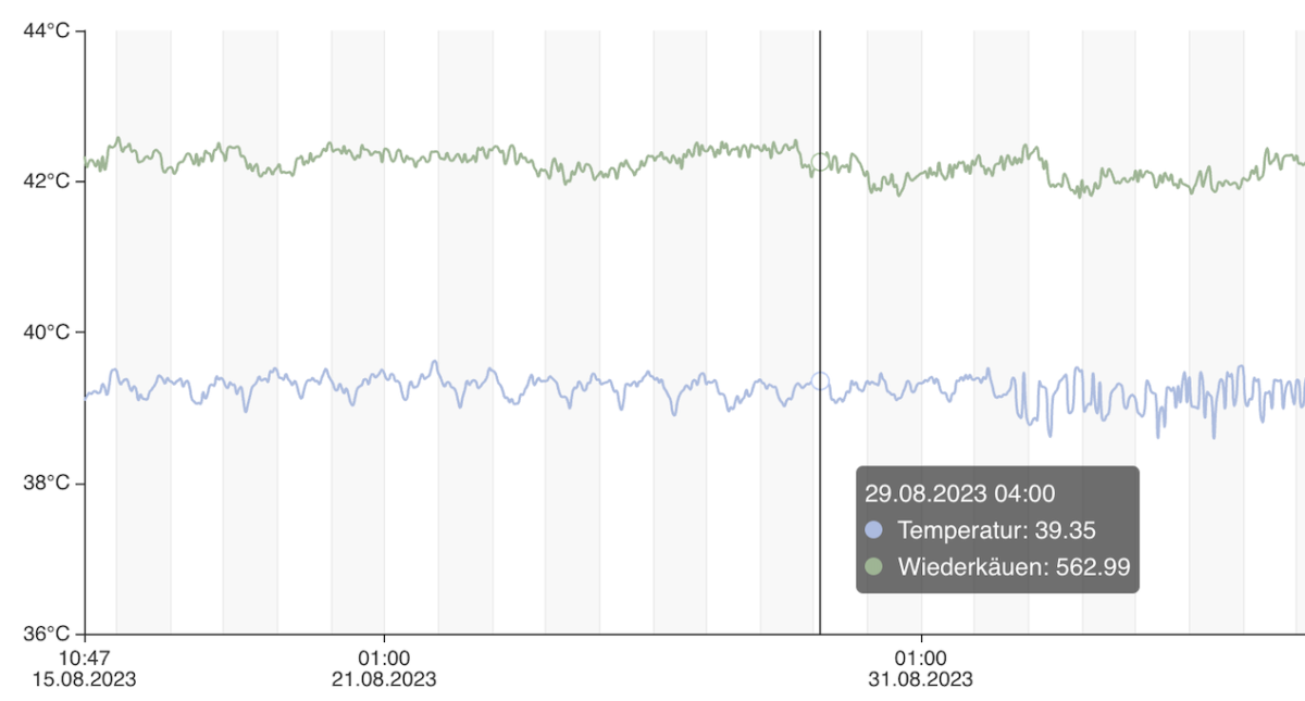 Schon gewusst? Kühe können selbst steuern, wann sie mit dem Wiederkauen stoppen und wann sie die Aktivität wieder fortsetzen. Stoppt die Wiederkautätigkeit abrupt, kann das ein Zeichen von Unsicherheit sein. Auch warme Temperaturen sind ein Faktor. Je beständiger Kühe dagegen über den Tag verteilt wiederkauen, desto besser. Denn das zeigt: Der Kuh geht’s gut! Das trifft auch auf Cookie zu, deren Wiederkäu-Index sich über die gesamten acht Wochen unserer Aufzeichnungen in einem Optimalbereich von acht bis zehneinhalb Stunden pro Tag bewegt. Daraus lässt sich schließen, dass sie sich auf Luisas Hof wohl fühlt. Damit das so ist, achten die angehende Agrarwissenschaftlerin Luisa und ihr Vater sehr darauf, den Alltag ihrer Kühe klar zu strukturieren und immer ähnlich ablaufen zu lassen. Denn je weniger Störungen die gewohnten Routinen unterbrechen, desto besser.