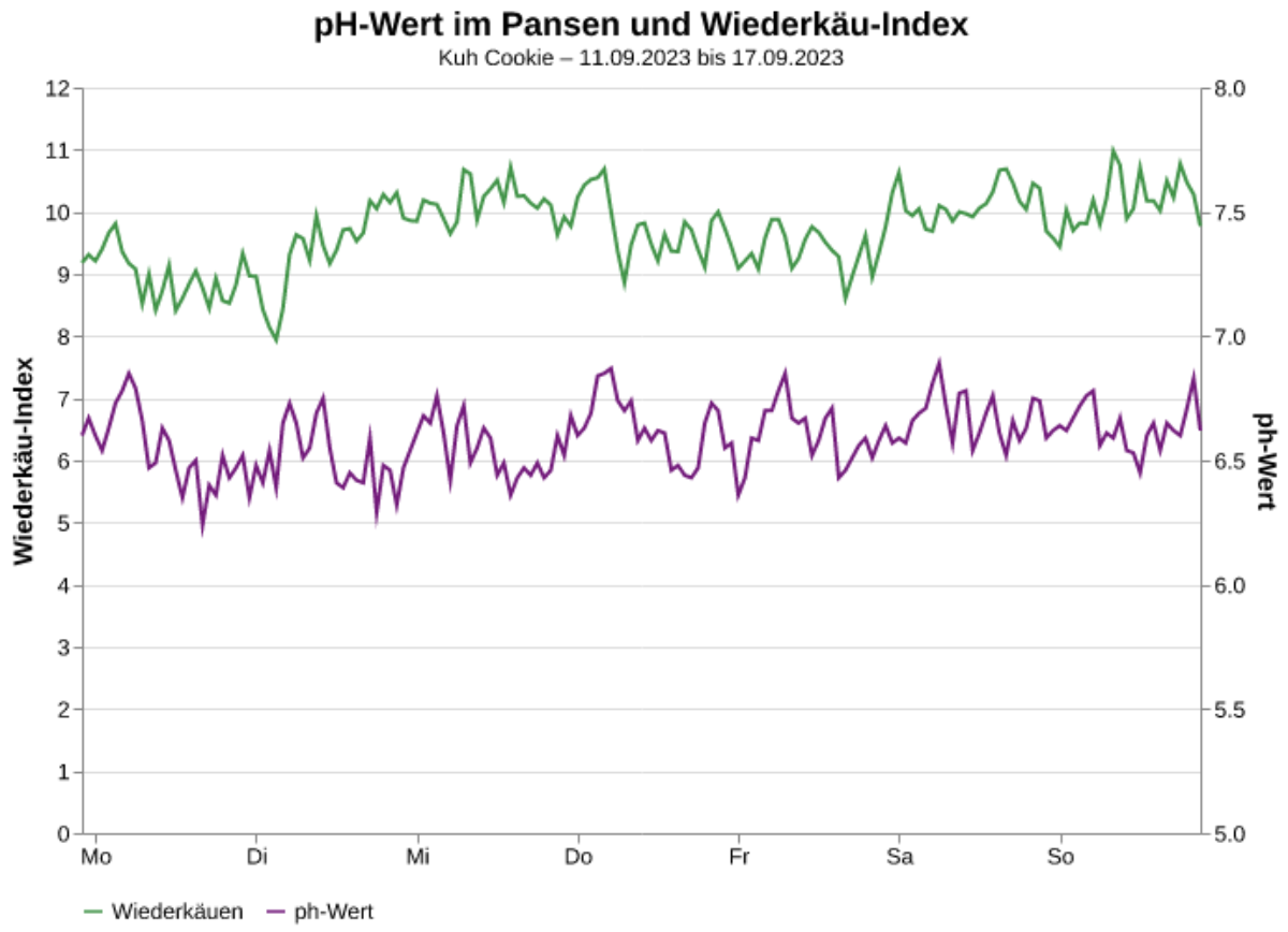 Wir befinden uns in der zweiten Woche nach dem Einbau des Melkroboters. Wiederkäuverhalten und pH-Wert zeigen: Cookie kommt prima zurecht mit den neuen Routinen!