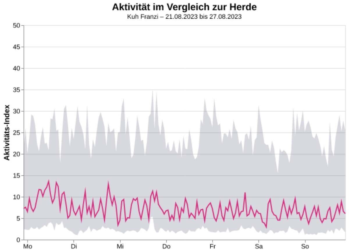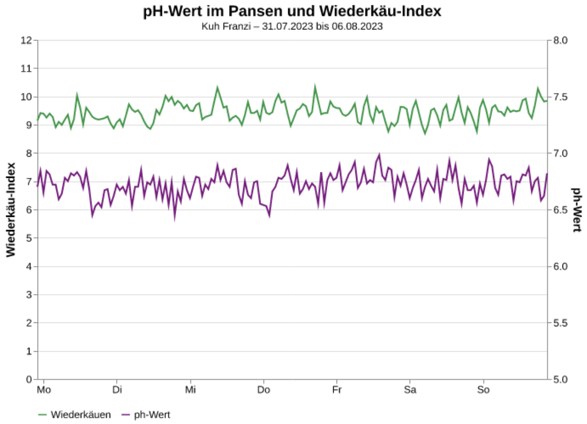 Bei Franzi hat das im Zeitraum unserer Datenaufzeichnung ganz wunderbar funktioniert. Über die gesamten acht Wochen weist sie einen pH-Wert von durchschnittlich 6,1 auf – man spricht hier auch von einem 'gesunden Pansenmilieu'. Anders formuliert: Alles im grünen Bereich! Anhand der Grafik von Woche 1 (ab 31. Juli) sehen wir, wie ein optimaler Verlauf aussieht. Wir sehen regelmäßige und eher geringfügige Ausschläge – sowohl beim pH-Wert als auch beim Wiederkäu-Index. Das spricht dafür, dass Franzi das Futter gut verträgt – und das trotz der warmen Temperaturen draußen.