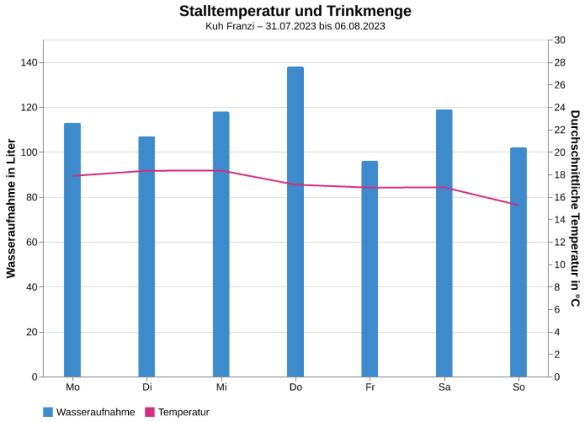 Wirft man einen Blick auf die Daten, fällt auf: Der Umbau des Stalls hat sich bezahlt gemacht! Der Klimasensor wurde ganz bewusst an der kritischsten Stelle angebracht. Trotzdem bewegen sich die Werte auch bei großer Hitze draußen im moderaten Bereich. Dazu Martin: “Wirklich heiß wird es bei uns im Stall eigentlich nicht. In der Regel sind die Temperaturen angenehm.” Worauf die beiden Landwirt:innenn außerdem acht geben ist, dass die Tränken immer sauber sind und das Wasser gut nachfließen kann. Denn frisches und sauberes Wasser ist das wichtigste Futtermittel von allen und Grundlage für eine gesunde Kuh.