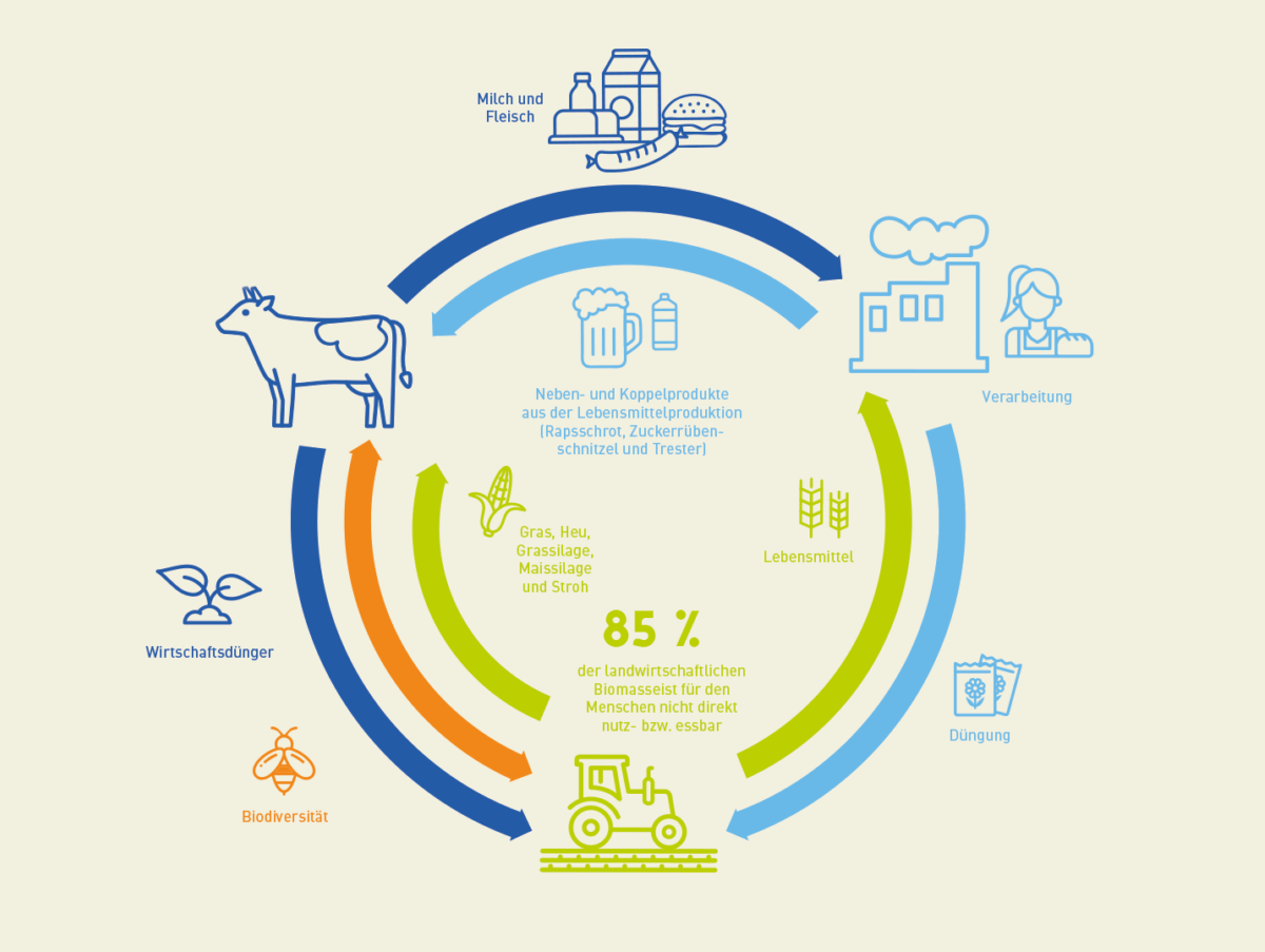 Kühe können aus allen Pflanzenbestandteilen wertvolle Lebensmittel machen. Sie verdauen Gras, auch in Form von Heu und Silage und andere Pflanzenreste, wie Blätter und Halme der Hafer- oder Weizenpflanze. Auch Reste aus Brauereien und der Pflanzenölherstellung stehen auf dem Speiseplan! All diese Nährstoffe wären verloren, gäbe es die Kuh nicht.