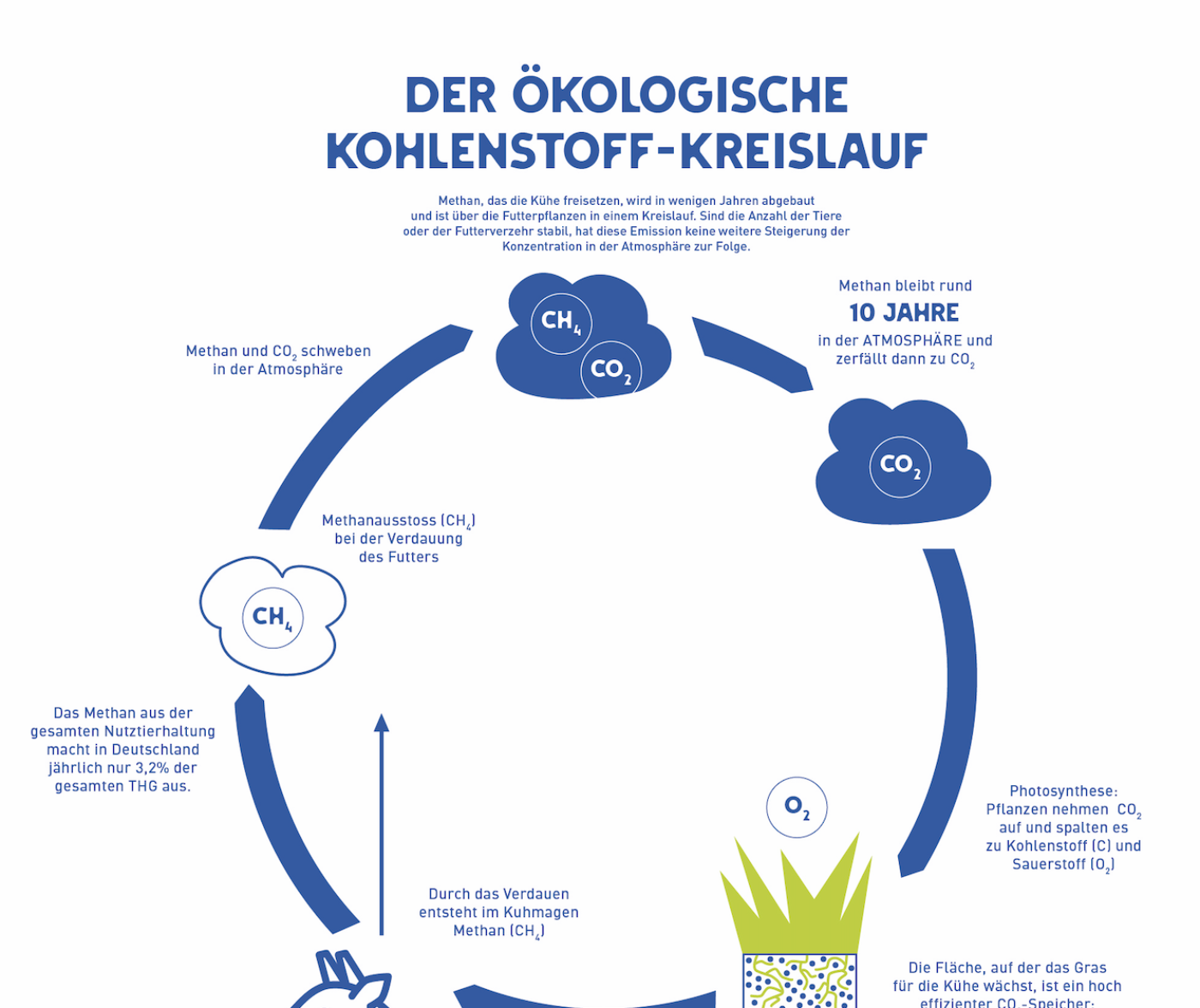 Methan, das die Kühe freisetzen, wird in wenigen Jahren abgebaut und ist über die Futterpflanzen der Kühe in einem Kreislauf. Hier geht es zur Infografik.