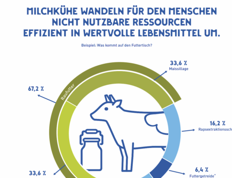 Milchkühe erhalten in der Hauptsache reichlich vorhandenes natürliches Raufutter. Ein Großteil des Futters wäre durch den Menschen nicht nutzbar, Milchkühe wandeln dieses effizient um.