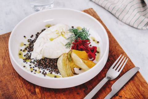 Aus Belugalinsen, geschmortem Fenchel, Orangenfilets, eingelegten Zwiebeln und einer cremigen Burrata zaubert ihr einen fruchtig-frischen Salat - der sich auch als Hauptspeise eignet.