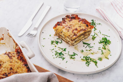 Es muss nicht immer Fleisch und Nudelteig sein. Diese vegetarische Lasagne bekommt durch Sellerie-Schichten und einer Pilzfüllung auf Béchamel-Soße einen spannenden Twist. Köstlich!